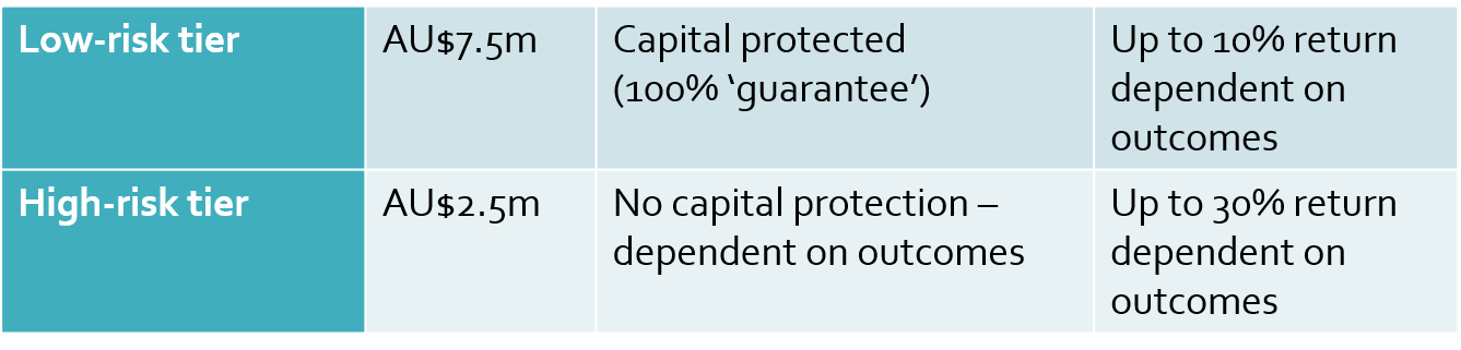 Once again, we see the NSW Government offering a guarantee, which means that the Government will pay even if the service does not produce the desired outcomes for recipients. In the previous NSW social benefit bond this guarantee was for between 50% and 75% of investor capital. This time it’s 100% of investor capital guaranteed, but only for the low-risk tier of investments, worth $7.5m or 75% of total investment. This may be an investment by the Government in establishing a market and track record for social impact bonds, rather than a model we can expect to see replicated in future years. The $7.5m of the bond with protected capital will also accrue variable returns up to 10%, dependent on outcomes. An additional $2.5m high-risk tier of investment will involve capital at risk, but will offer outcome-dependent returns up to 30%.