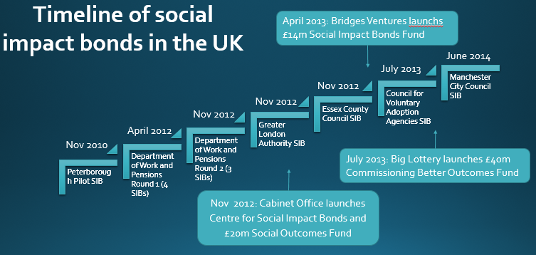 The timeline of UK Social Impact Bond milestones below shows the significant responses by the Government and investors to a nascent market.