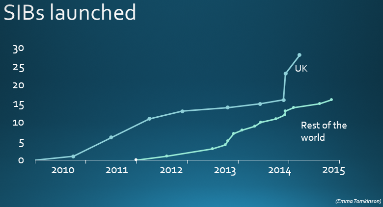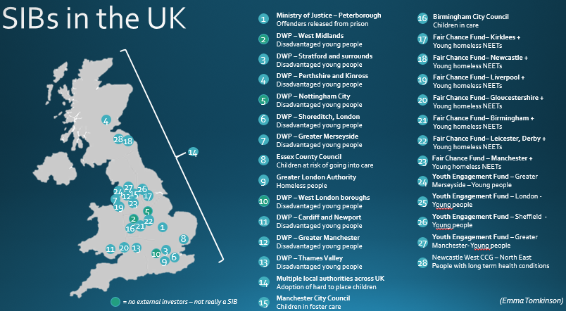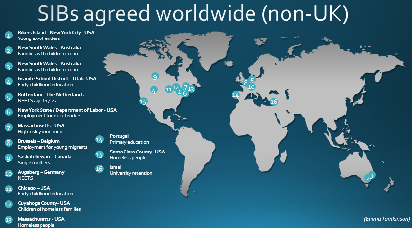These maps and charts are accurate to the best of my knowledge as of November 2015. The images are slightly clearer if you click on them. Will try to keep them up to date, but feel free to give me a nudge if I fail to. I only count Social Impact Bonds that have been agreed by all parties and subsequently announced publicly. Happy to accept corrections!