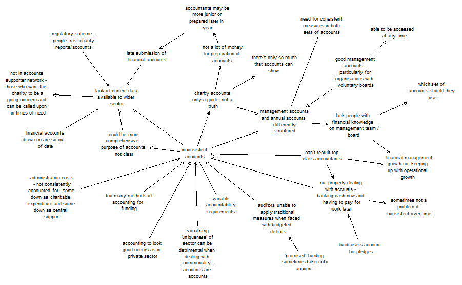 This is a concept map of the responses of eight UK interviewees as they related to using financial accounts as a data source for judging the financial health of social purpose organisations. It is raw data and as such, should not be assumed to reflect recommended practice. Arrows roughly mean ‘leads to’. Arrows with a minus sign next to them mean ‘does not lead to’.