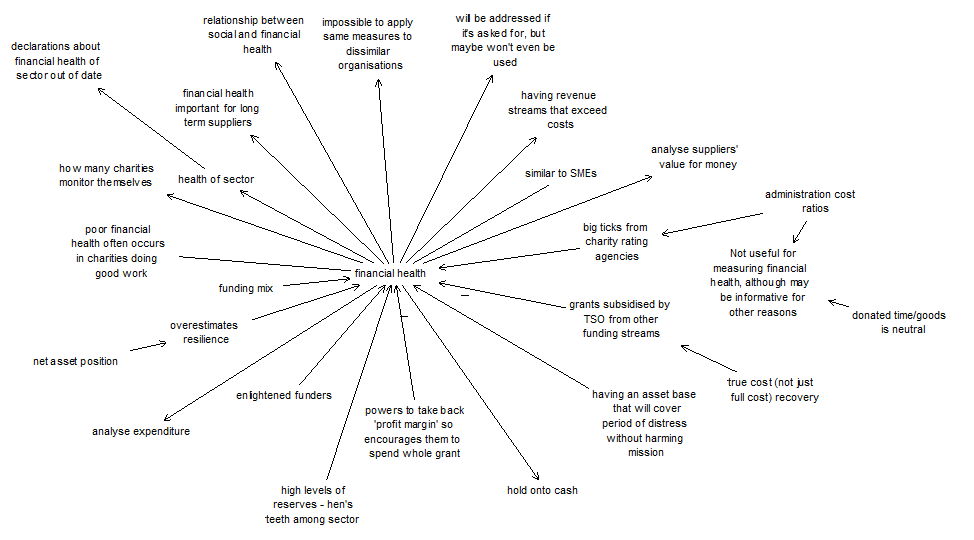 This is a concept map of the responses of eight UK interviewees as they related to judging the financial health of social purpose organisations. It is raw data and as such, should not be assumed to reflect recommended practice. Arrows mean ‘leads to’. Arrows with a minus sign next to them mean ‘does not lead to’.