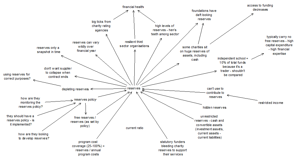 This is a concept map of the responses of eight UK interviewees as they related to judging the reserves of social purpose organisations. It is raw data and as such, should not be assumed to reflect recommended practice. Arrows mean ‘leads to’. Arrows with a minus sign next to them mean ‘does not lead to’.